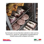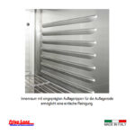 seitlich in die Korpus/Schäumung eingeprägte Auflagerippen (24 Stk á 55mm Abstand), mittig herkömmliche kippsichere Einhängvorrichtung und Auflagewinkel, Trägerprofile innen ohne Werkzeug abnehmbar, inkl. 3 Stk kunststoffbeschichtete Auflageroste GN2/1 pro Tür und 3 Stk Mittelroste.