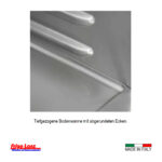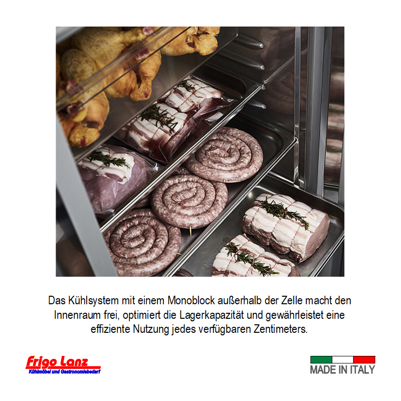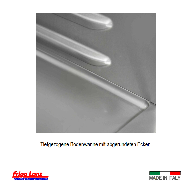 Innen und Außen aus Cr.Ni.Stahl, Rückwand lackiertes Blech, 75 mm Isolierung (bei seitlichen Auflagerippen 83 mm Isolierung), Türblatt 65 mm Isolierung, Innenraum mit runden Ecken für leichte Reinigung, Bodenwanne tiefgezogen, Höhenverstellbare Füsse H.150 mm (Vorbereitet für Sockelmontage).
