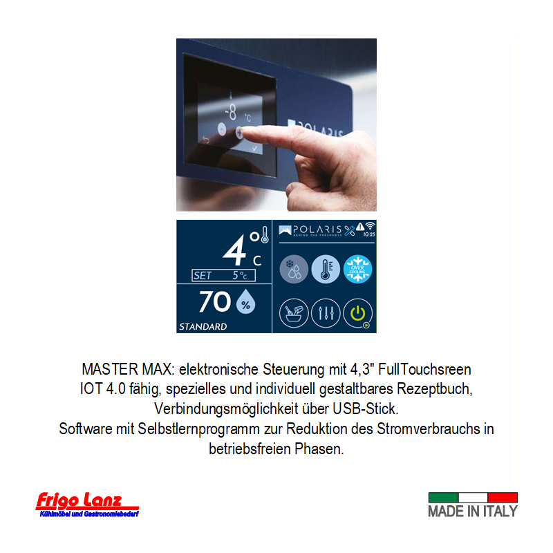 elektronische Steuerung: 4,3″-FullTouchscreen, IOT 4.0 fähig, Software mit Selbstlernprogramm zur Reduktion des Stromverbrauchs in betriebsfreien Phasen, Spezielles und individuell gestaltbares Rezeptbuch, Verbindungsmöglichkeit über USB-Stick, Bei Serie TNN ist die rel. Luftfeuchtigkeit von 60 ÷ 90 % einstellbar.