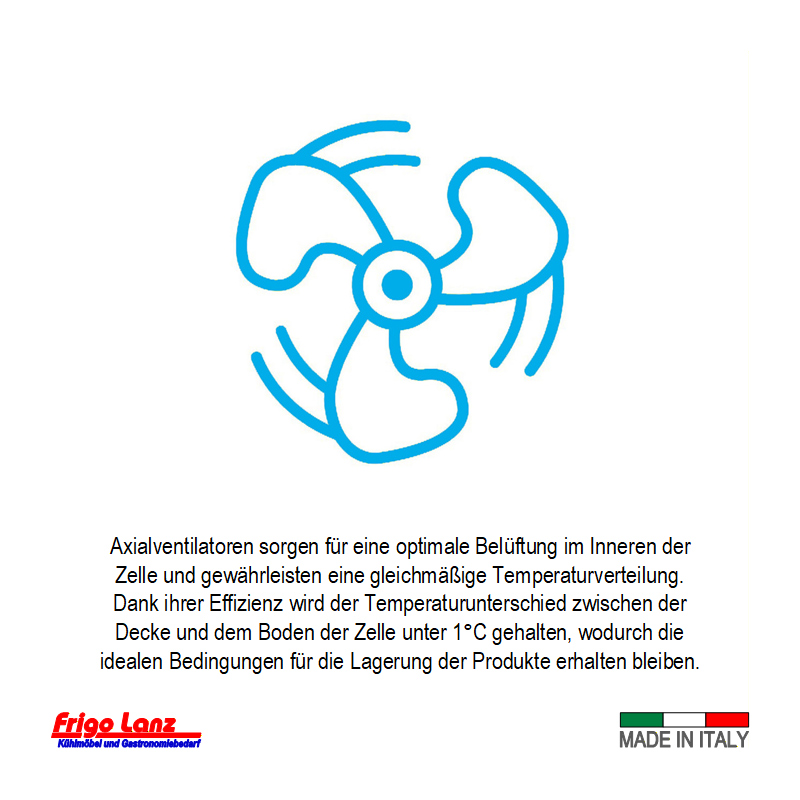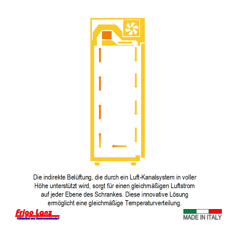 innovatives Kühlsystem mit verdampferfreiem Innenraum – Energieoptimiert, Verbesserte Interne Luftführung (Temperatur-Unterschied zwischen Boden / Decke <1°C) und verringerter Kälteverlust bei Türöffnung durch Front-Luftstrom.