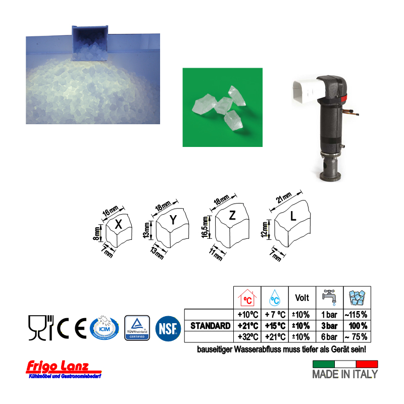 Steckerfertiger luftgekühlter Cocktaileiserzeuger mit eingebautem Speicher, Eisproduktion durch Getriebemotor mit Gefrierzylinder und Schnecke aus Edelstahl, (wartungsarm), Pressschneidkopf aus Messing bei Eisauswurf, Füsse höhenverstellbar: 110÷150 mm, Gehäuse aus Cr.Ni.Stahl, Rückseite aus plastifiziertem Blech, Luftansaugblende aus Kunststoff mit Schmutzfilter, Klappdeckel aus Kunststoff, Luftaustritt rückseitig, mit frontseitigem Ein-/Ausschalter, Gehäusedeckel zur leichteren Reinigung abnehmbar, mechanische Steuerung durch Thermostate und Abtauuhr.