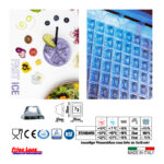Steckerfertiger luftgekühlter Würfeleiserzeuger mit eingebautem Speicher, Füsse höhenverstellbar: 110÷150 mm, Eisproduktion durch vertikalen Verdampfer inkl. Sprühsystem mit Wasserpumpe und Wanne, Gehäuse aus Cr.Ni.Stahl, Rückseite aus plastifiziertem Blech, Luftansaugblende aus Kunststoff mit Schmutzfilter, Klappdeckel aus Kunststoff, Luftaustritt rückseitig, mit frontseitigem Ein-/Ausschalter, Gehäusedeckel zur leichteren Reinigung abnehmbar, mechanische Steuerung durch Thermostate und Abtauuhr.